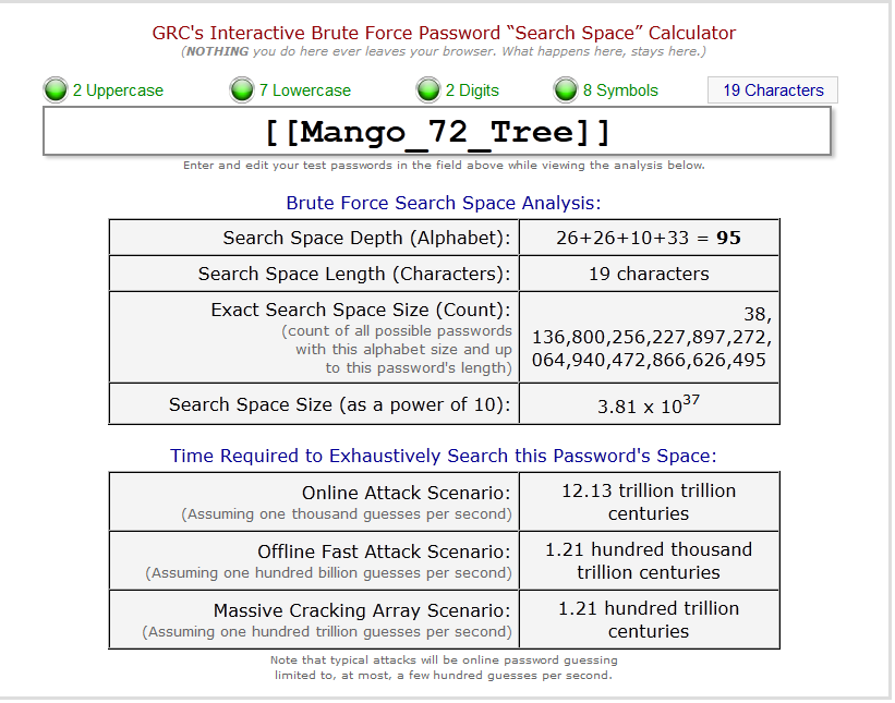 An example could be [[Mango_72_Tree]] (please don’t use this password, ever :P) which is 19 characters long, but reasonably easy to remember (if you’re used to 6-8 length passwords don’t worry, you’ll get the hang of it soon). The GRC search space tool says this password will be cracked in a hundred trillion centuries with one hundred trillion guesses per second!