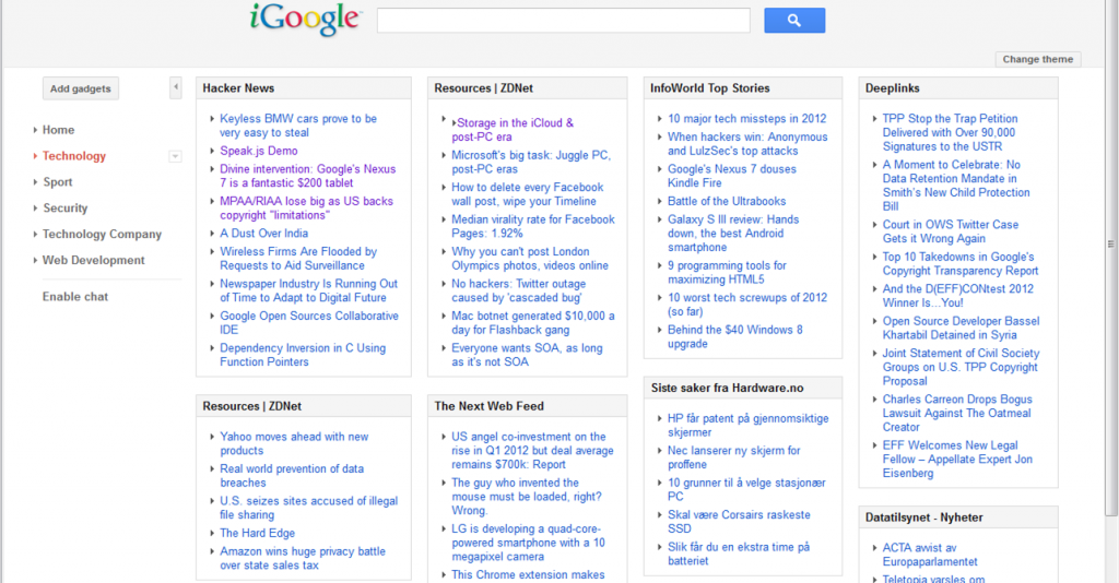 So iGoogle is being phased out (service stops at the 1st of November 2013) and of course with my luck I’m being quite “dependant” on it. It’s not an essential service but it’s mighty handy to keep me updated on all the things I care about and try to follow. It’s not just a list of articles but the way you can organize the gadgets/feeds and have a good overview is where the strength in iGoogle lies.